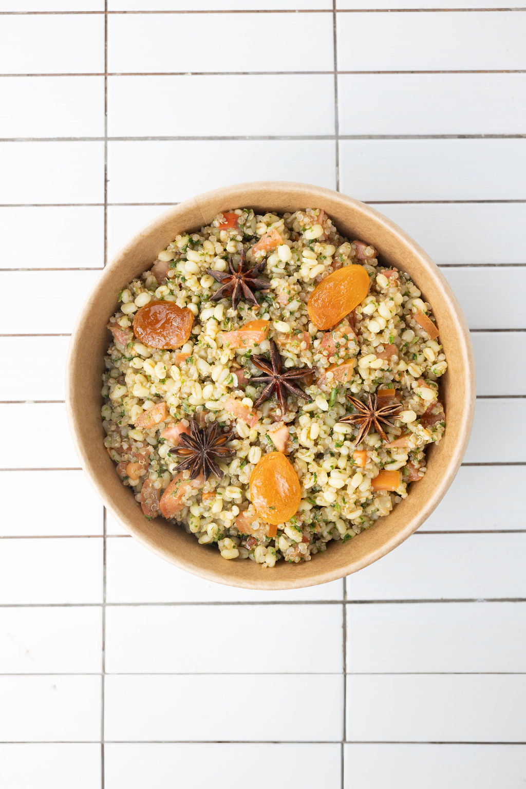 Why: Saffron has natural antidepressant properties and improves mood. Wheat pearls provide complex carbohydrates that gradually release their energy. The vegetable brunoise ensures a varied intake of vitamins and minerals.