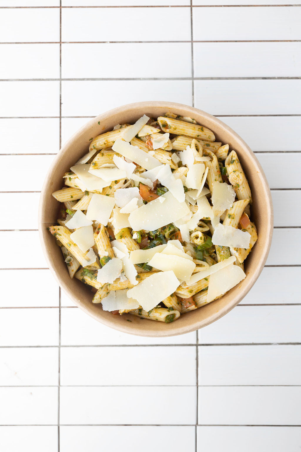 Why: Pasta provides complex carbohydrates for sustained energy. The basil in pesto contains neuroprotective compounds. The combination with harissa boosts metabolism and improves blood circulation. Parmesan adds complete protein.