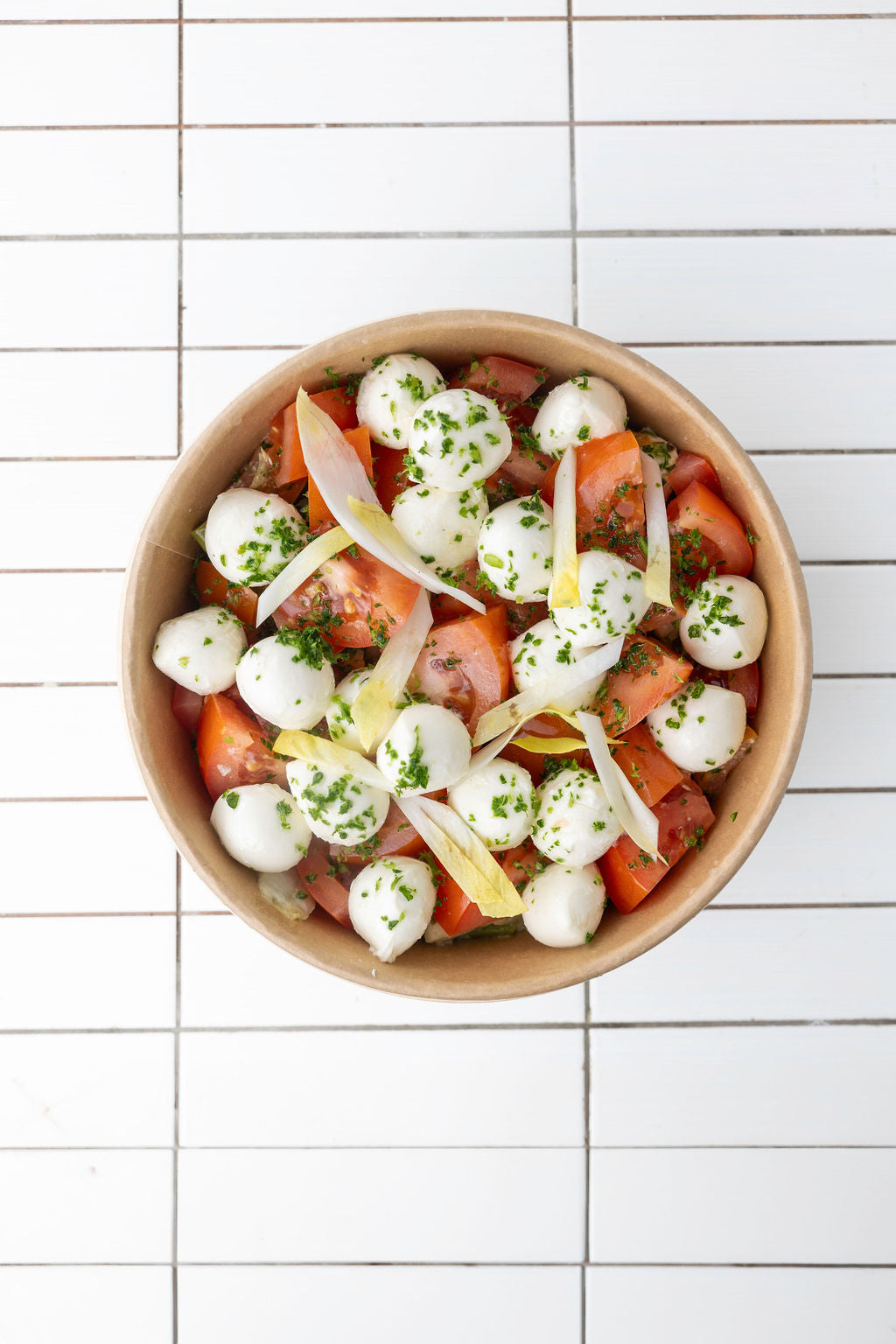 Mozzarella (lait) , tomates , haricot vert , basilic , olives , huile d’olives , sel et poivre